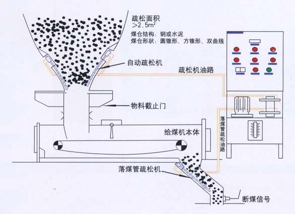 3、自動(dòng):當(dāng)給煤量明顯減少或斷煤時(shí),與疏松機(jī)配套安裝的傳感器自動(dòng)輸出啟動(dòng)信號(hào),疏松機(jī)立即運(yùn)行,清除堵塞,使原煤恢復(fù)流動(dòng)。